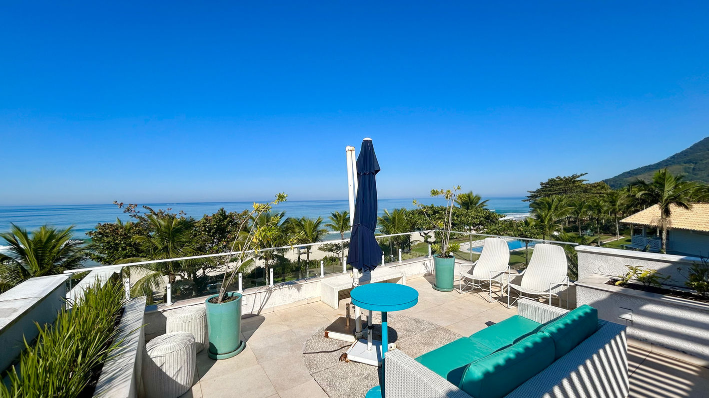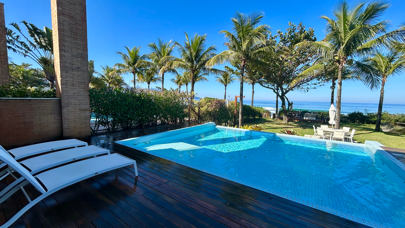 Casa de frente para o mar em condomínio pé-na-areia, na Praia de Maresias. Com 380 m² construídos e 600 m² de terreno, possui saída privativa para a praia. Essa casa conta com 05 suítes no piso superior, sendo 02 com varanda com vista para o mar, além de uma suíte máster com closet. Ampla área social integrada à varanda e piscina, espaço gourmet completo e cozinha americana equipada. Além disso, possui no terceiro piso, uma jacuzzi e sala panorâmica com vista espetacular para toda a praia. Vagas para até 04 veículos